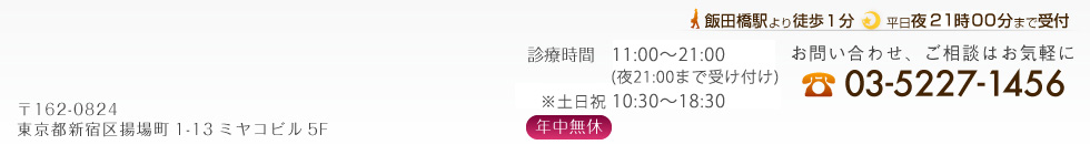 飯田橋の整骨院なら、土日祝日も受付している飯田橋接骨院にご相談ください!厚生労働省認可の国家資格者がすべての施術を担当します。気になる症状がございましたらお気軽にお問合せください。(各種健康保険取り扱い)